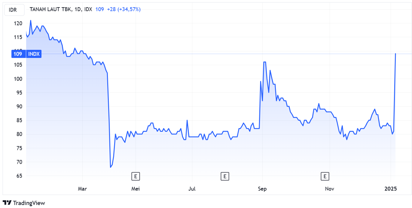 JAKARTA, investortrust.id – PT Tanah Laut Tbk (INDX) mendadak ditutup melesat hingga auto reject atas (ARA) sebanyak 34,57% menjadi Rp 109 pada penutupan perdagangan saham Bursa Efek Indonesia (BEI), Selasa (7/1/2024). Lompatan harga terjadi setelah ada pengumuman ekspansi ke sektor hilirirasi kelapa.