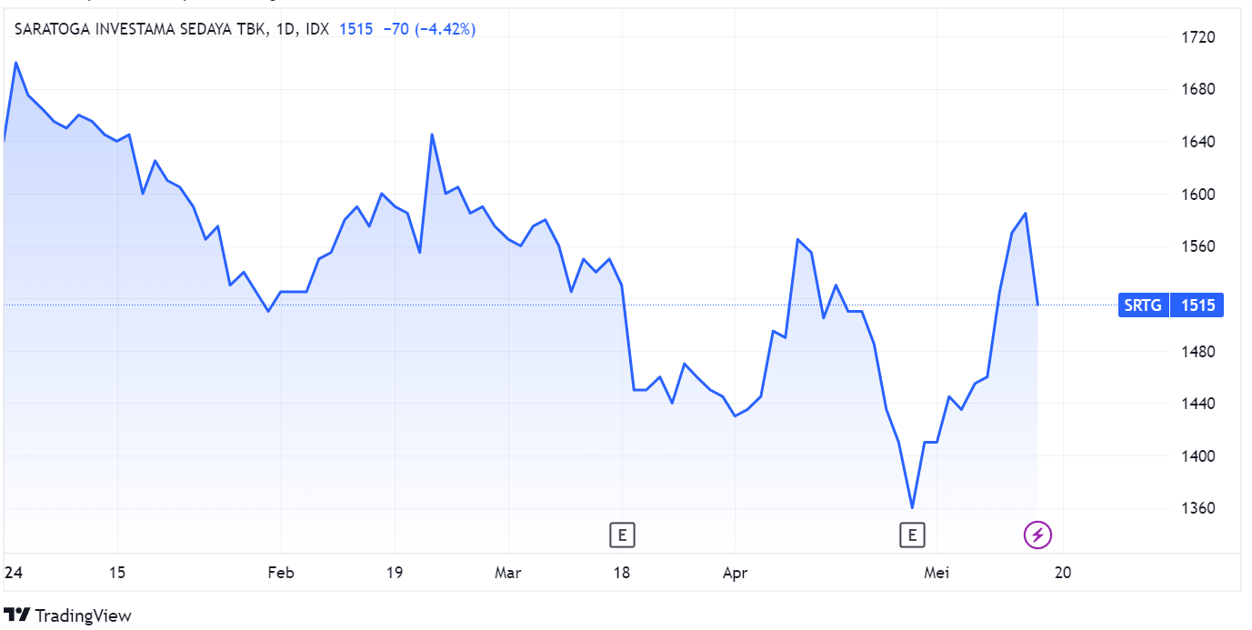 Hingga akhir 2023, Saratoga Investama (SRTG) membukukan rugi Rp 10,14 triliu, dibandingkan periode sama tahun sebelumnya dengan laba Rp 4,61 triliun. Kerugian tersebut akibat penurunan saham perusahaan portfolio utama perseroan, seperti saham PT Adaro Energy Indonesia Tbk (ADRO) dan PT Merdeka Copper Gold Tbk (MDKA). Sedangkan hingga Maret 2024, nilai aset investasi (NAB) bersih SRTG mencapai sebesar Rp 47,5 triliun.
