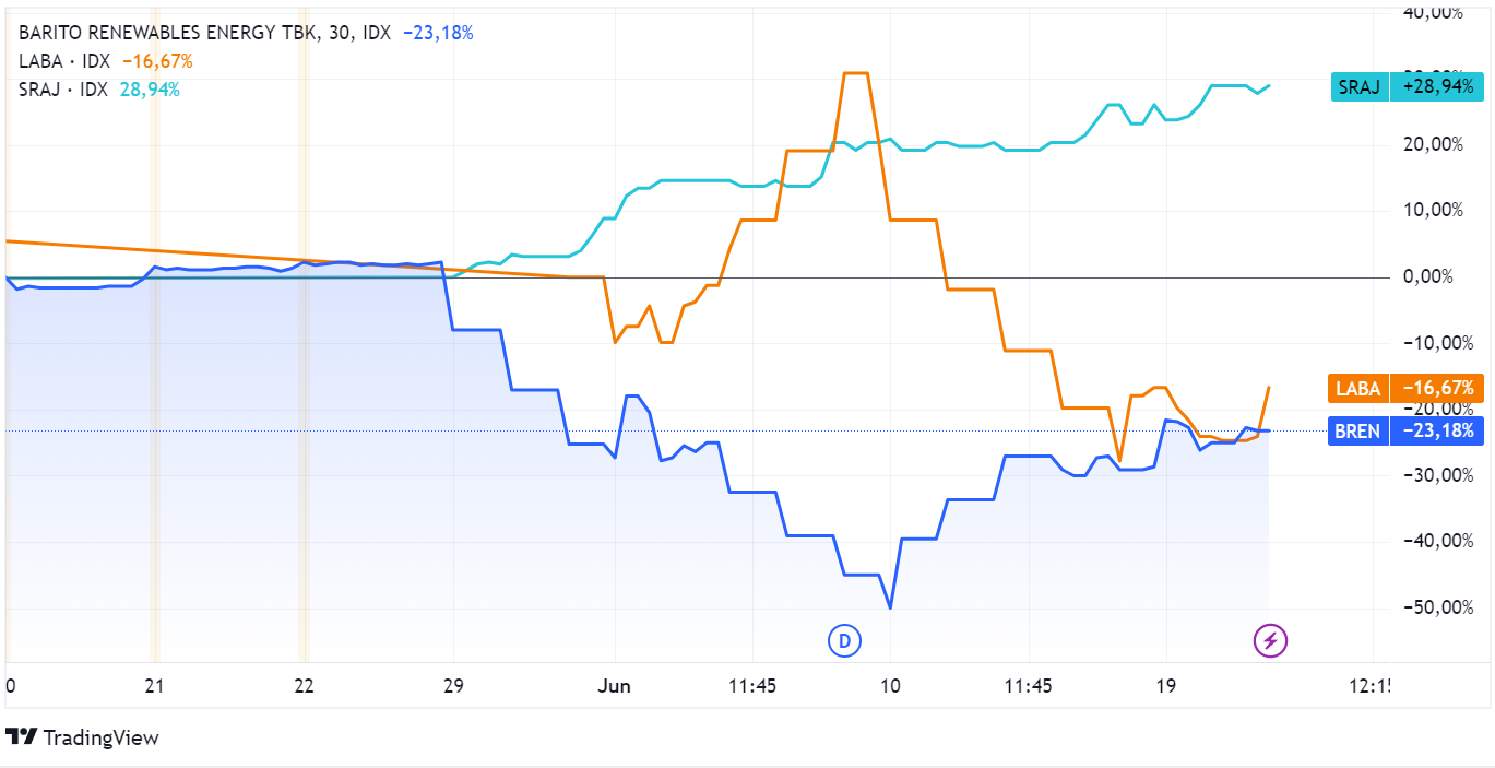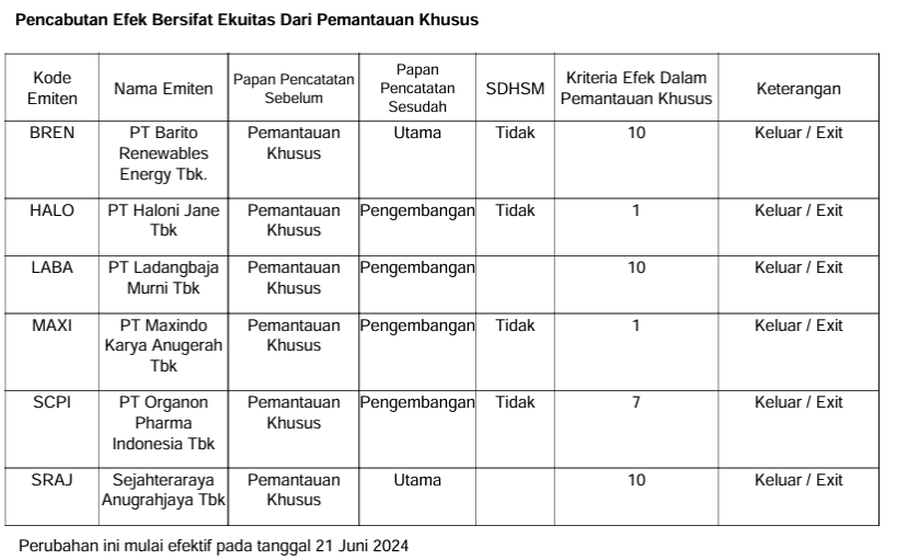 BEI memasukkan saham BREN dalam papan pemantauan khusus sejak 29 Mei 2024. Sedangkan saham SRAJ masuk papan pemantauan khusus sejak 28 Mei 2024 dan saham LABA masuk papan pemantauan khusus sejak 31 Mei 2024.